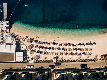 Aerial view of sandy beach with colorful umbrellas, swimming people, clear sea bay with transparent blue water and green trees at sunset in summer. Travel in Croatia, Adriatic sea. Top view. Seascape