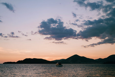 Motor yacht sails on the sea towards the mountains at sunset