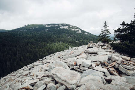 white stones on top of a mountain, mountain landscape in cloudy weather, gray clouds in the sky, a Christmas tree grows on stone placers.