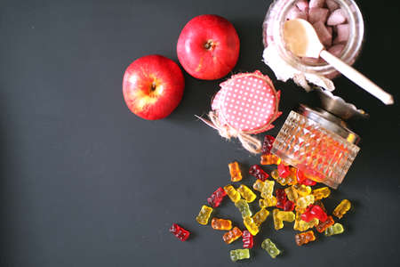 Marmalade in a vase on table. Sweets in a bowl on a black background. Multicolored jelly sweets for children.