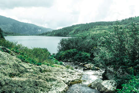 The peak view from the shore of a mountain lake. Journey through the hill country. Tourist attractions, natural beauty.