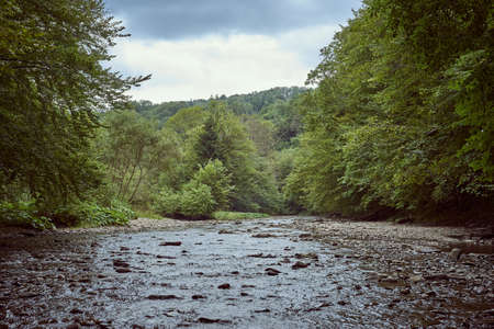 A shallow mountain river with stony banks, flowing in the middle of a quiet forest