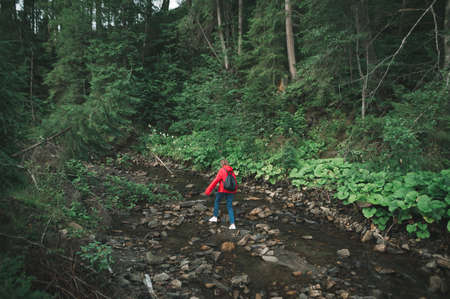 Minimalistic photo of a female traveler walking through the mountain river in the fir forest. Back view on a tourist girl in a red jacket with a backpack going to the mountain woods near the stream.