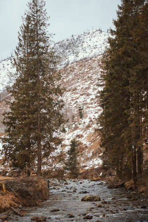 Beautiful landscape with coniferous forest in the mountains. Selective focus.