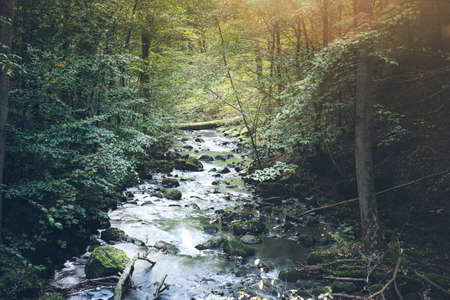 Dark atmospheric mountain landscape with turbulent mountain river among black rocks with moss in narrow gorge. Beautiful alpine scenery with tree trunk on wet mossy stones near powerful mountain river