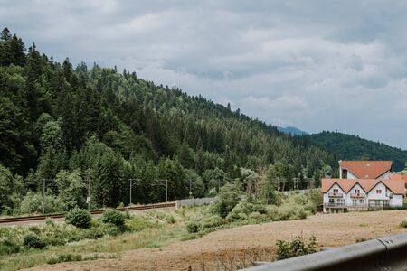 Green mountains of Carpathians in the middle of forest against background of a dramatic sky.