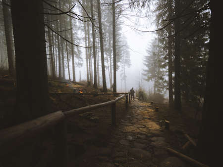 Mysterious landscape the dense fog falling on the mighty Tatras Mountains in Slovakia. Beauty and strength of wild untouched nature. Ideal background for fairy tales illustrations and collages.