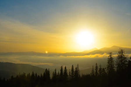 Foggy sunrise in the mountains. Landscape with fog and clouds.