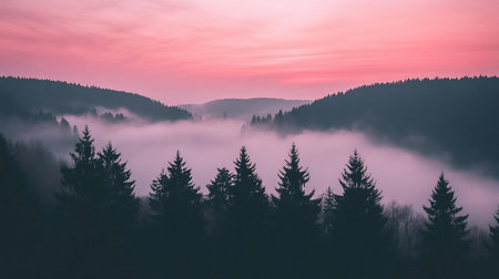 A serene landscape featuring a valley filled with fog, framed by silhouetted evergreen trees under a pink-hued sky, creating a dreamy, atmospheric scene.
