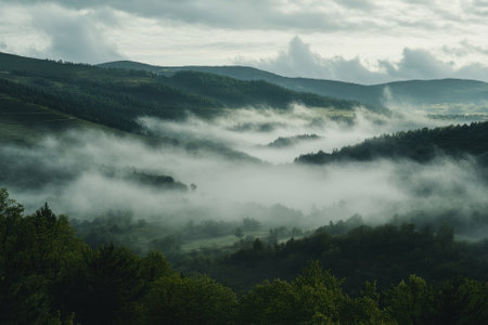 Misty valley with rolling hills, cloudy skies, and green trees.