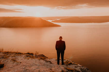 man in formal suit groom stands on mountain holds his hands in pockets. fiery orange sunset sunset rays through clouds. panoramic view from cliff to river lake sea in distance silhouettes islands