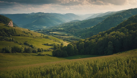 A landscape of hills covered in greenery under a cloudy sky in the countryside