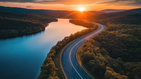 A stunning aerial view capturing the tranquil beauty of a winding river at sunset. Vibrant colors paint the sky as the sun dips behind rolling hills, surrounded by lush greenery.