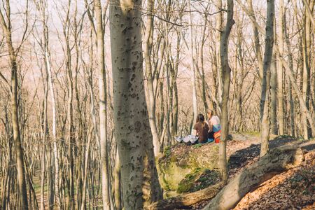 two women girlfriends sitting on the ground at the cliff in forest. spring hiking concept