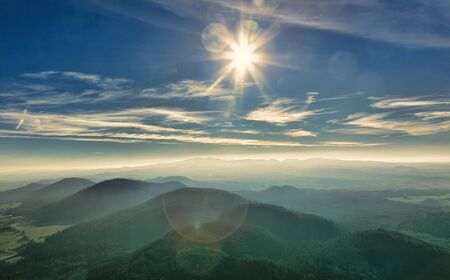 Landscape of warm light sun rays on sky through the clouds over the mountains in Czech republic, Jeseniky
