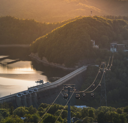 Cable Car Over Solina Lake Dam at Dusk with Full Moon in the Background at sunset, Bieszczady Mountains, Poland