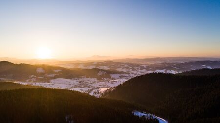 Aerial view sunny beautiful landscape of winter hills and mountains with forest thickets on a frosty winter evening against a blue sky and the setting sun. Place for advertising