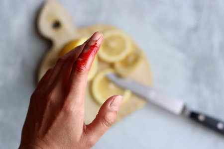 A man holding a knife with his hand being cut by the blade, AI
