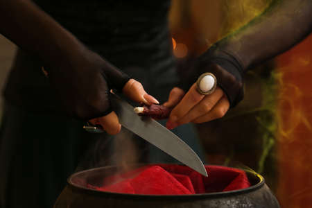 Witch making potion during black magic ritual, closeup