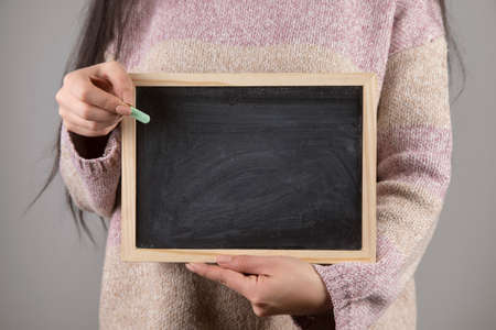 Small empty chalkboard on a light grey textured background. Blank. Blackboard Background. Blackboard texture