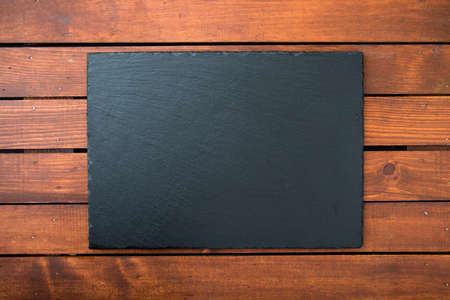 Slate board on wooden background. Cutting board. Space for text. Top view.
