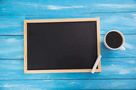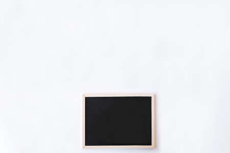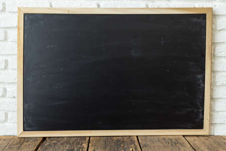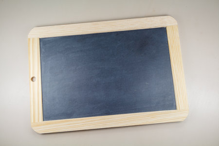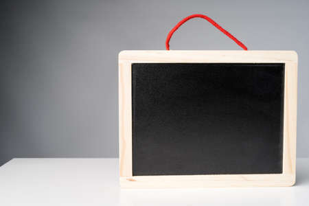 Blank school blackboard or chalkboard with wooden frame on white table. Copy space on the left.