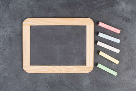 A blackboard with space for text and a set of colored crayons on a wooden background. Start of school year and sale of school supplies. Home education and learnin after pandemic. Flatlay.