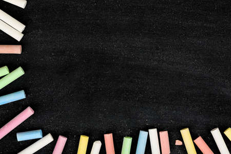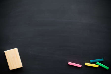 Back to school concept. Chalk pieces on black empty chalkboard with copy space for text