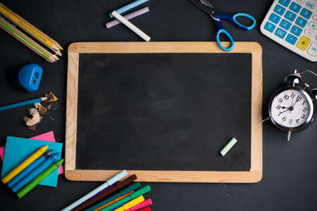 Back to school, blackboard layout and accessories vivid colorful. Copy space