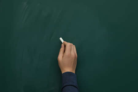 Writing and drawing chalk on a black board. Accessories for saving the lesson content at school. Dark background.