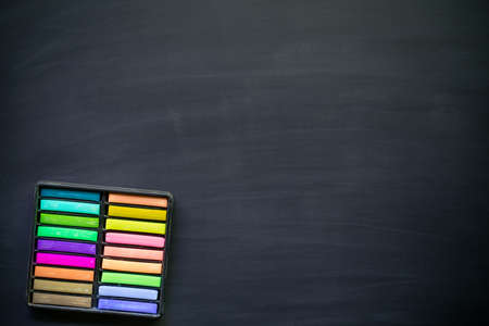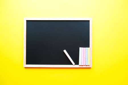 Colored chalk on a dark school board on the yellow background. Back to school concept. Place for your text. Flatlay.