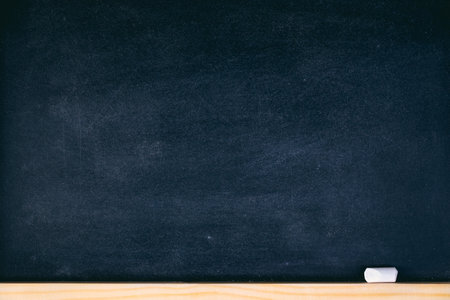 School chalkboard, blank empty black board and white chalk piece on wooden frame sill, copy space
