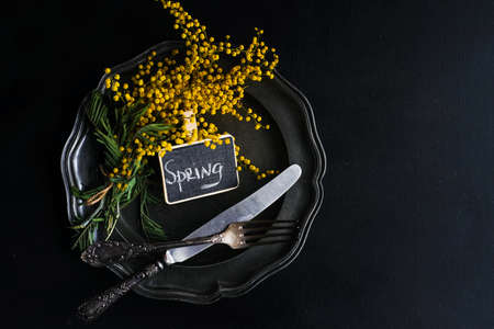 Table setting with vintage empty black plate on rustic wood. Dark background. Top view. Copy space