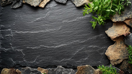 This image showcases a dark textured surface complemented by delicate greenery and an elegant bowl, perfect for culinary presentations and food styling.