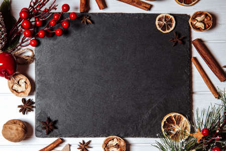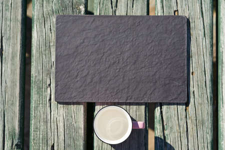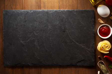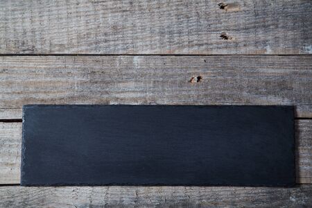 Slate board on wooden background. Cutting board. Space for text. Top view.