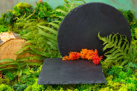 Staged display for product photography, with black stone slabs, tree stump, Stabilized Lichen and fern leaves. Lush forest themed arrangement.