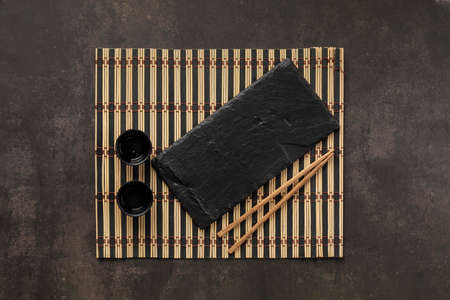 Slate stone cutting board set with copy space for text or food with copy space for text or food, top view flat lay, on black wooden table background