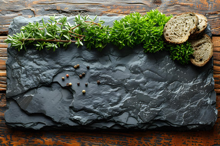 Rustic culinary presentation featuring fresh green herbs and artisan bread elegantly arranged on a textured slate slab. assorted peppercorns add a touch of culinary flair, creating a visually appealing combination of natural elements. Generative AI