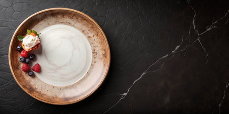 Black stone surface with empty plate. Copy space background. Generative AI art