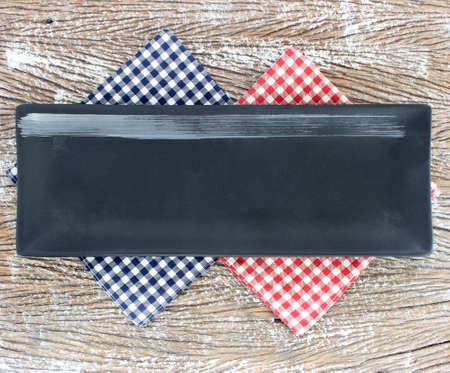 Top view black stone food tray with copy space above white planks background and kitchen dishtowel.