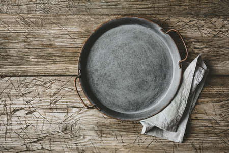 Empty pizza platter for homemade baking set up on dark concrete. Food recipe concept on dark stone background texture with copy space.