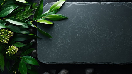 A peaceful arrangement of lush green leaves and delicate stones surrounding a smooth black stone surface invites relaxation and mindfulness. Nature's harmony shines brightly here.