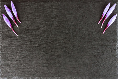 Saffron crocus buds on both sides on a black background. Beautiful purple flowers. Inscription or text on a black background.