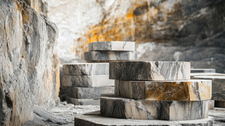 Captivating view of a quarry showcasing large stone blocks against a vibrant blue sky and fluffy clouds. This scene captures the beauty of Earth's materials.