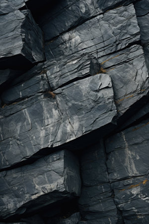 Dark, Textured Slate Rocks Found at a Coastal Area Captured During Overcast Weather on a Cool Day. Generative AI