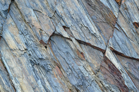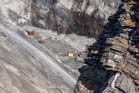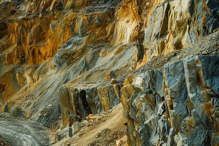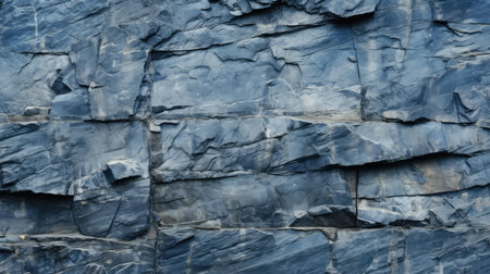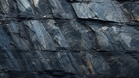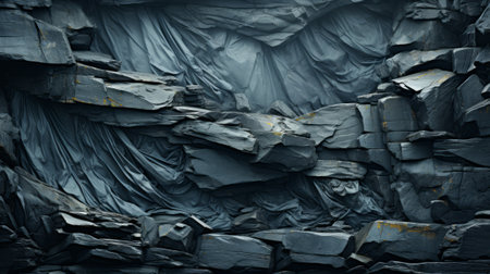 Close-up view of jagged slate rocks forming rough, textured layers in a mountain quarry. Perfect for backgrounds or geology concepts, highlighting natural rock structure.