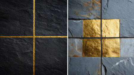 Gold leaf accents beautifully contrast with dark slate tiles, creating an artistic and modern aesthetic for home decor.