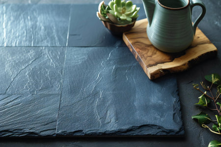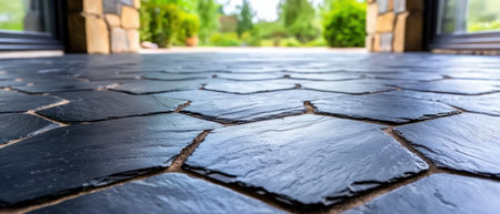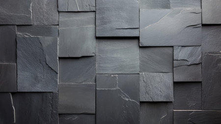 Background of large slate tiles with visible cuts and varying shades of gray, creating a modern look.