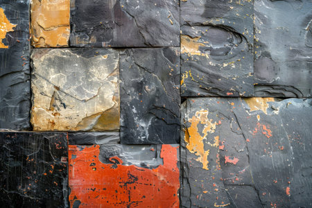 Dark slate tiles are artistically arranged on an orange background, showingcasing textures.