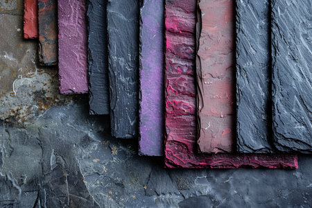 Close-up view of weathered stone slabs in shades of black, red, and purple.